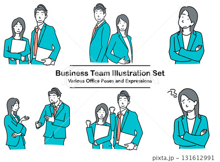 圖庫插圖: 在辦公室工作的業務團隊的面部表情和姿勢