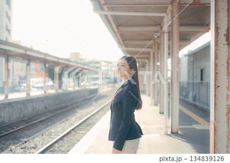 一位日本女大學生手持智慧型手機,在月台上等車。