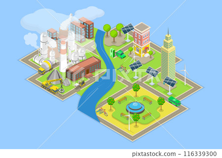 插圖素材: 3D Isometric Flat Vector Illustration of Sustainability Vs Pollution, Climate Change Awareness