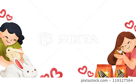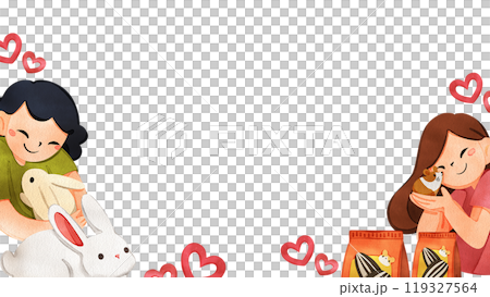 插圖素材: Womens are enjoying their pets rabbit and hamster with pet food, hand-drawn watercolor frame