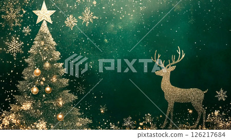 插圖素材: Christmas background with glittering christmas tree, snowflakes and deer with antlers