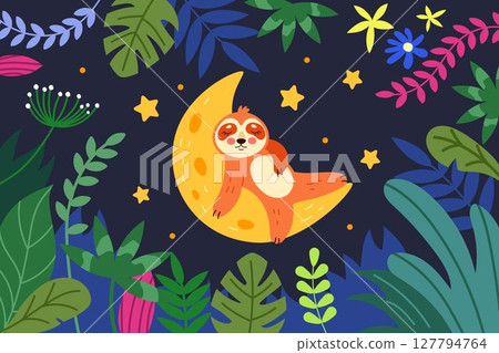 插圖素材: Sloth sleeps on hammock. Funny animal baby drawing. Cartoon kid dreaming on moon. Night forest. Illustration book. Children floral print. Sleepy mammal lying on crescent. Vector cute tidy background