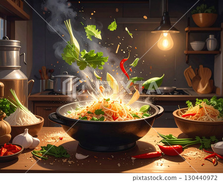 插圖素材: AI generated image of thai khanomjeen sawnam ingredients exploding in a modern kitchen with low light