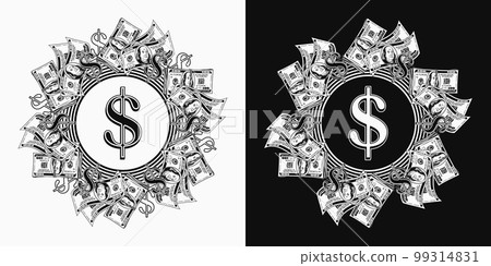插圖素材: Circular money frame with US dollars bills, dollar sign, copy space.