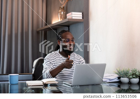照片素材(圖片): African american business afro man live online meeting on computer home. Freelance online sme marketing, young happy man video call meeting on laptop alone at home