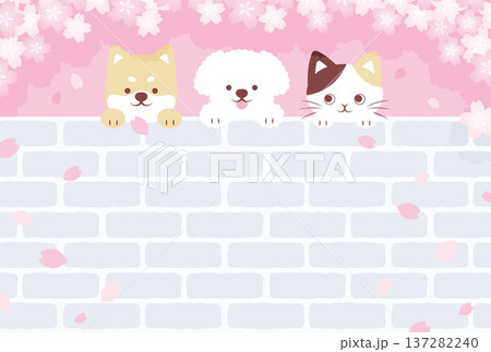 背景插圖描繪了櫻花,一隻狗和一隻貓從磚牆後面探出頭來。