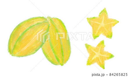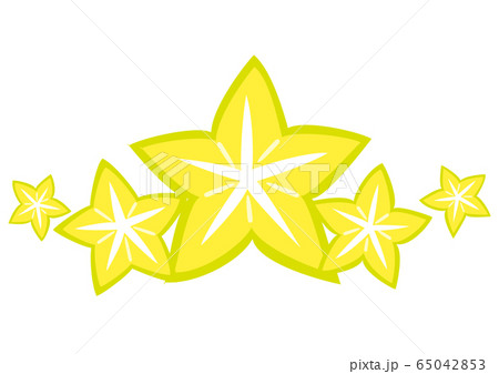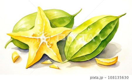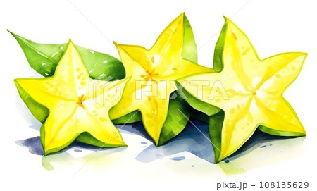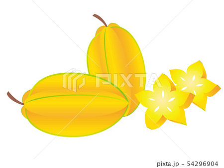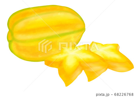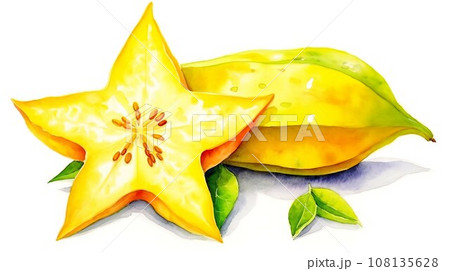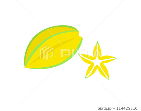 Ripe yellow starfruit cut in half, showing its star shape and juicy interior, flat illustration
