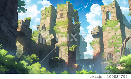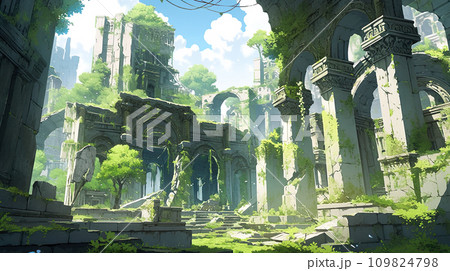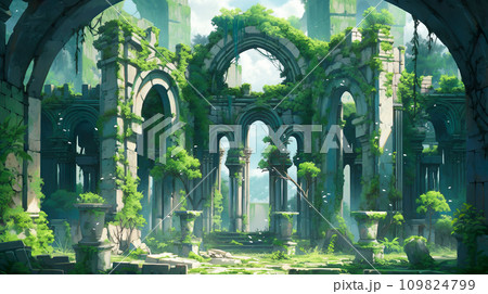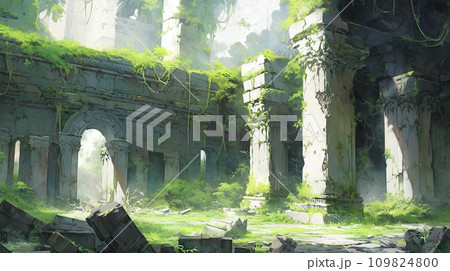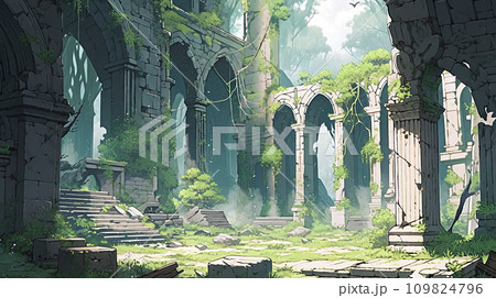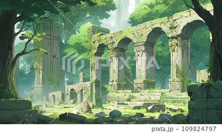 神秘森林廢墟的動漫風格插畫景觀“AI生成圖像”