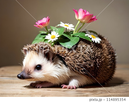 可愛的點刺猬,兩條腿站著,手裡拿著花