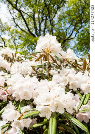 倫敦郊區里士滿公園裡盛開的白色杜鵑花,沐浴在明媚的春日陽光下
