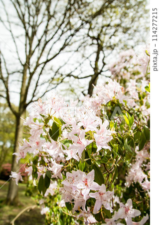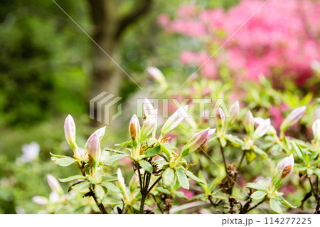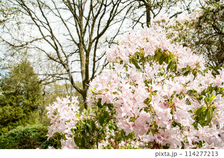 倫敦郊區里士滿公園伊莎貝拉種植園的白色花蕾和淡粉紅色杜鵑花