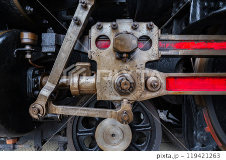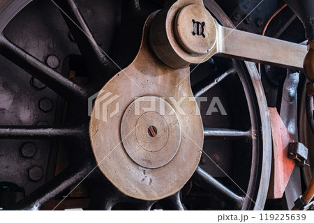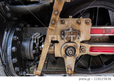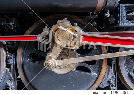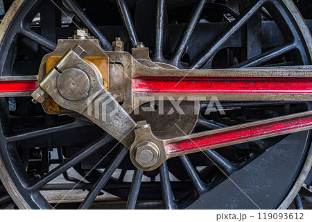 Close-up of the drive wheels and the drive rod of a historic steam locomotive, transport