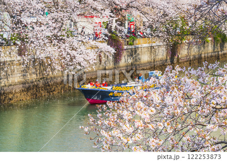 大岡川步道的春日景色:觀光船沿著河流航行,周圍環繞著盛開的櫻花 [神奈川縣橫濱市]