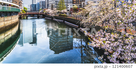 大岡川步道兩旁櫻花盛開。美麗的櫻花和城市景觀倒映在水面上。 [神奈川縣橫濱市]
