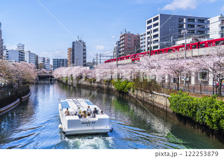 大岡川的春天景色,櫻花映襯著藍天,京急線沿河行駛[神奈川縣、橫濱市]