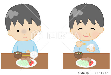 可愛的小學男孩,以乖巧的方式吃學校飯的插圖集白色背景