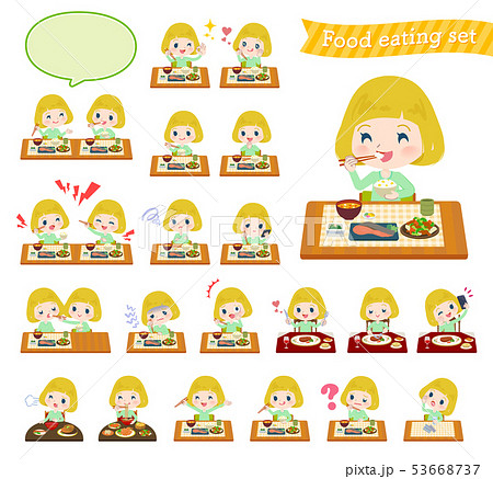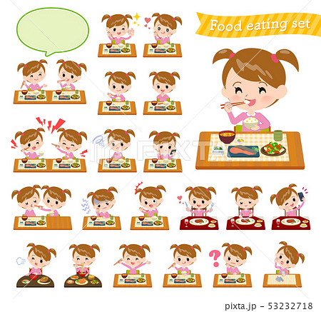 可愛的小學女孩,以乖巧的方式吃學校飯的插圖集白色背景