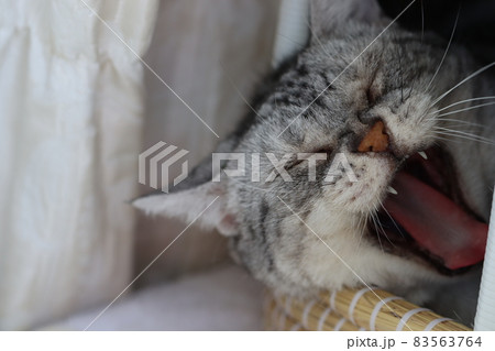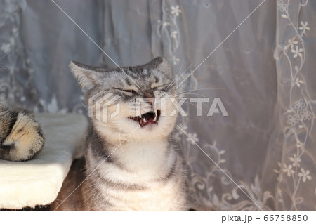 美國短毛貓藍虎斑,一隻張開嘴,舒服地打哈欠的貓