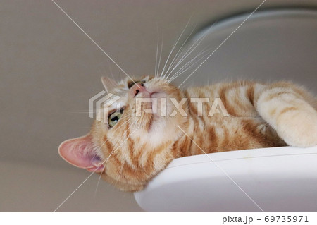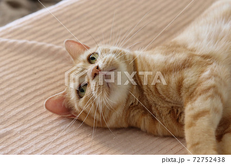 貓美國短毛貓紅色虎斑貓躺著,嚇得抬頭