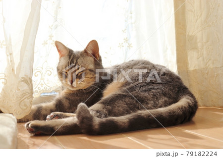 美國短毛藍虎斑貓在陽光明媚的窗簾下擺小睡