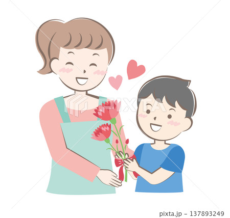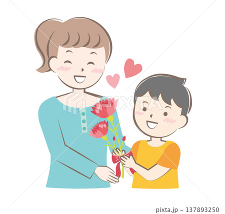 一幅插圖,描繪的是一個男孩在母親節送給母親康乃馨。