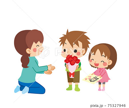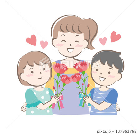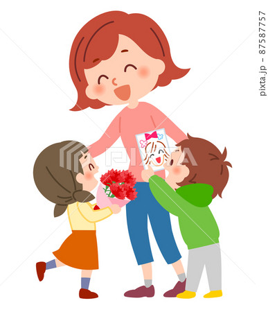 母親節當天,一位母親收到孩子們贈送的康乃馨的插圖。