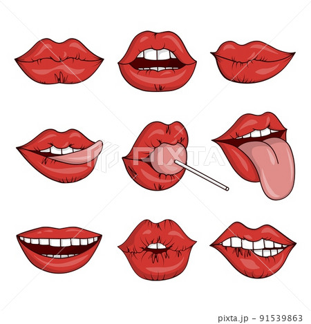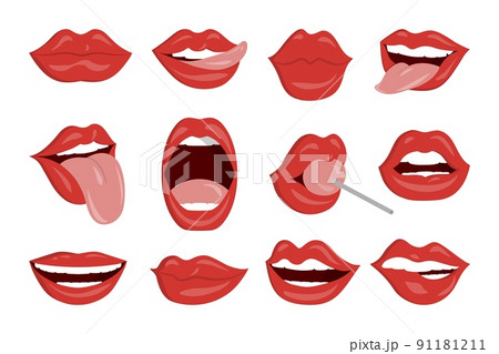 Mouth expressions. Smiling female. Open lips. Sticking out tongue. Sad face or laugh. Facial teeth visible. Surprised gesture. Lolli or cigarette. Candy eye. Red cosmetic lipstick. Vector cartoon set