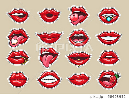 Candy lips patches. Vintage 80s fashion stickers with girl showing tongue and bitten lip with red