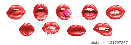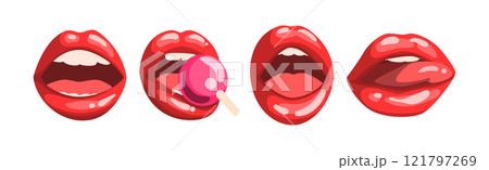 Red Glossy Lips as Girls Mouth with Lollipop and Half Open in Sensual Expression Vector Set
