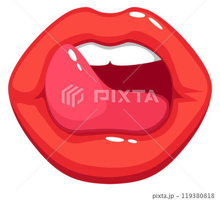 Cartoon illustration of red female lips licking, showing tongue and teeth, isolated on white background