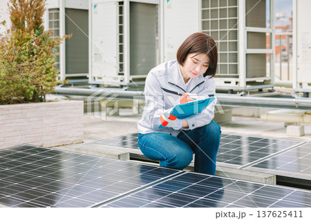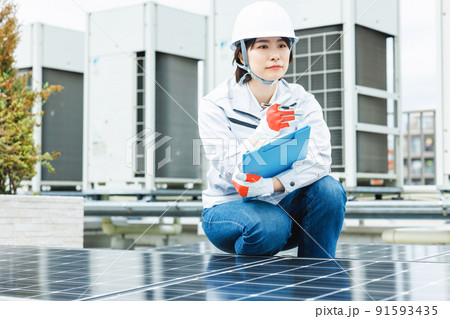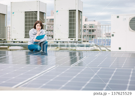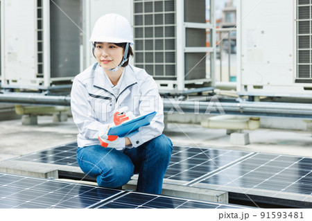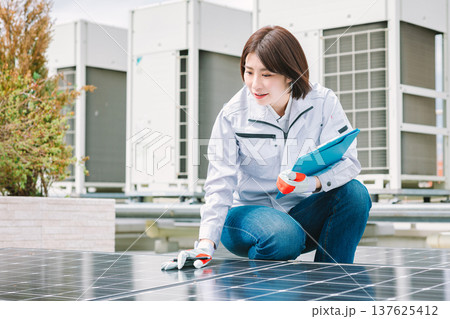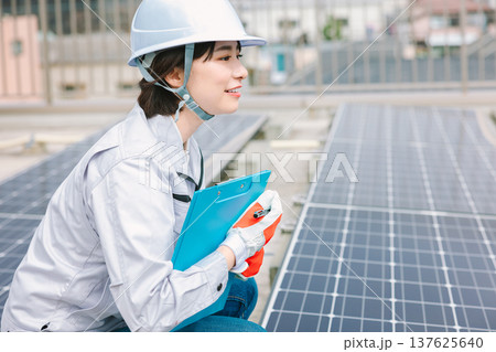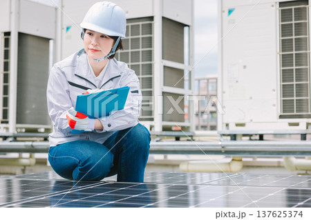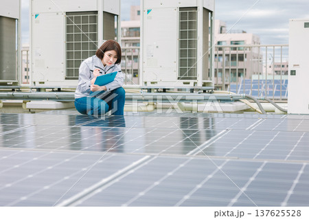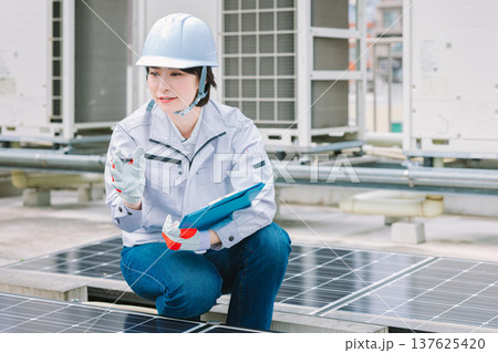 電力公司或電氣承包商穿著工作服的工程師站在太陽能發電/太陽能板(清潔能源)前