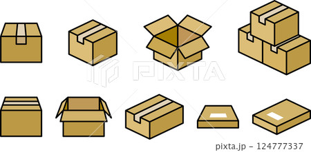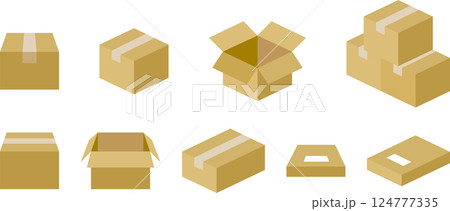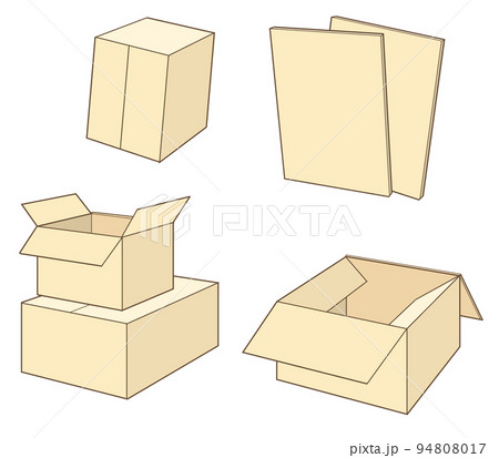 紙板和空盒子的插圖[4種,包裝,紙板,棕色,米色,移動,行李,垃圾]