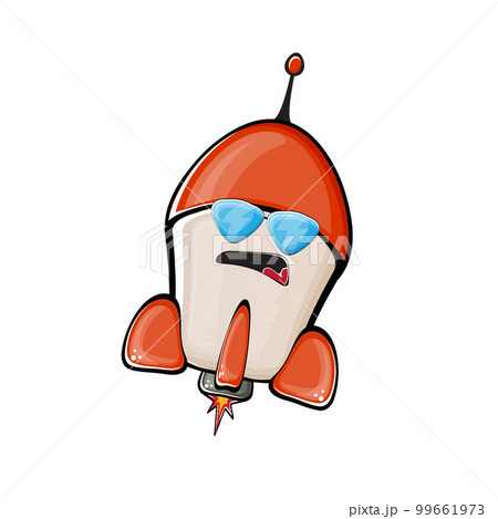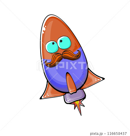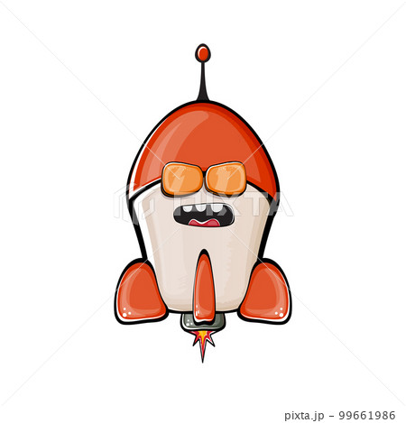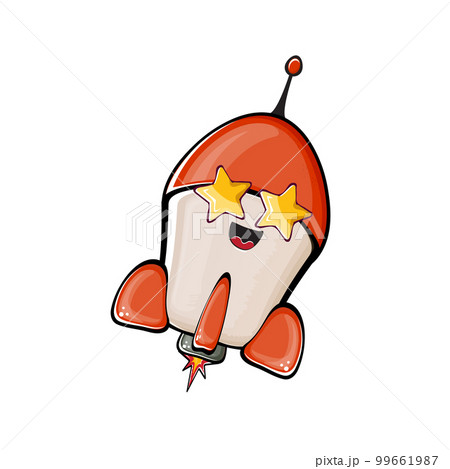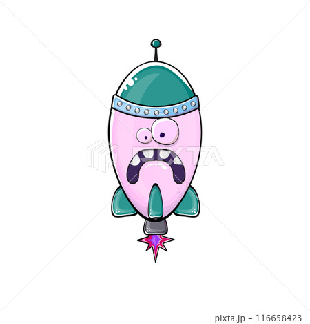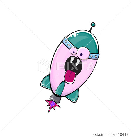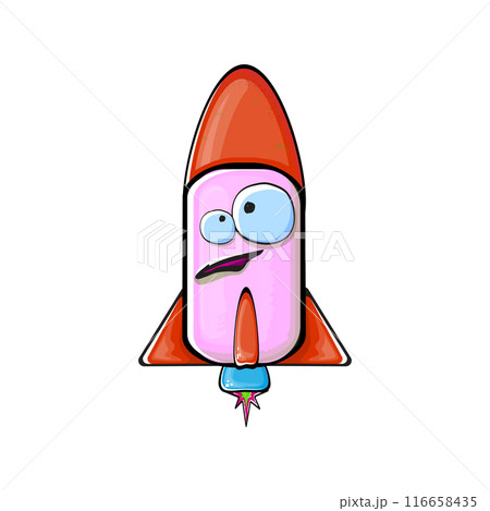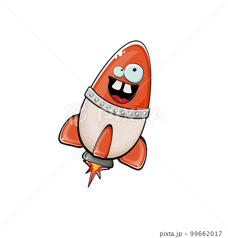 Rocket spaceship character. Cartoon space rocket isolated on white background. Funky spaceship and shuttle character with eyes and mouth. Vector retro space ship clip art, emoji, label and sticker