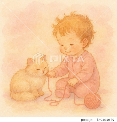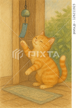 一隻棕色虎斑貓在玩風鈴的溫柔插圖