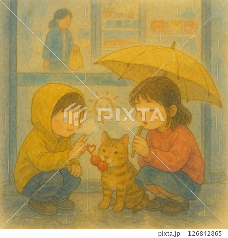 雨の日に猫と出会う子どもたちのやさしい時間 Children sharing kindness