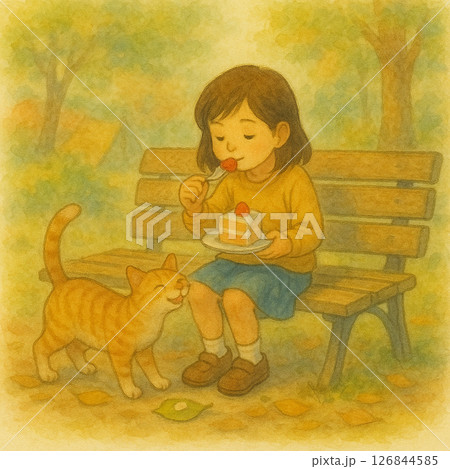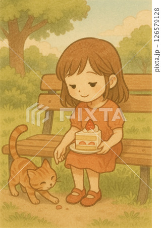 ベンチでケーキを楽しむ女の子と甘える猫 Girl enjoying cake on a bench