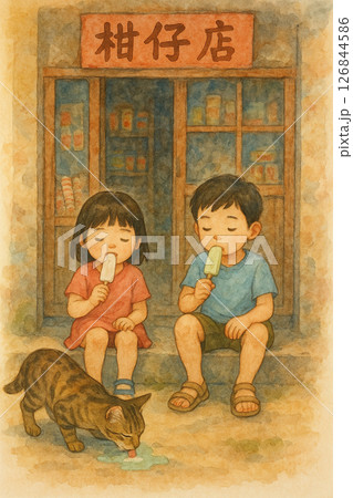 昔ながらの柑仔店でアイスを楽しむ子どもたち Children enjoying popsicles