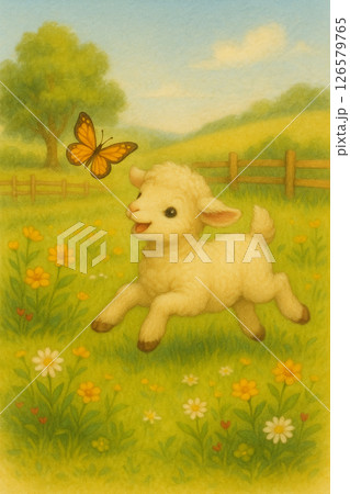 蝶を追いかける子ひつじ|Spring Lamb Chasing a Butterfly in Mea