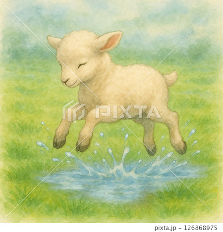 水たまりではねる子ひつじの水彩イラスト|Watercolor Illustration of a L