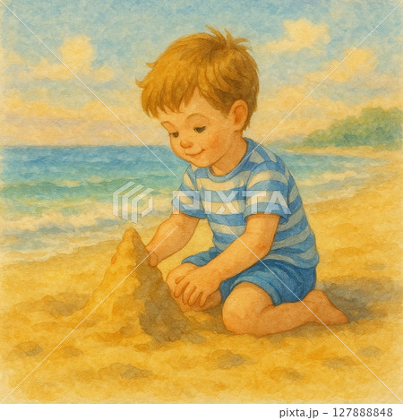 海邊的童年回憶 | 男孩在沙灘上玩沙 | 男孩在沙灘上玩沙的水彩插圖