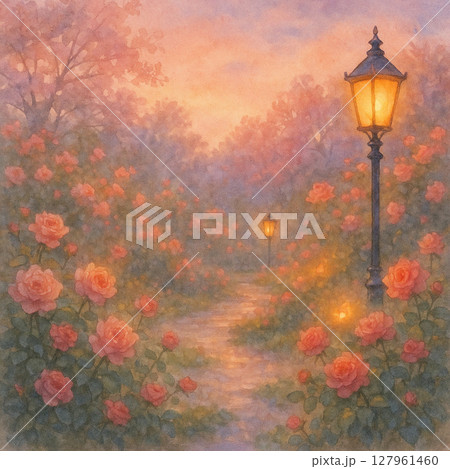 玫瑰園小徑與黃昏路燈水彩插圖 | 玫瑰園小徑與黃昏路燈水彩插圖