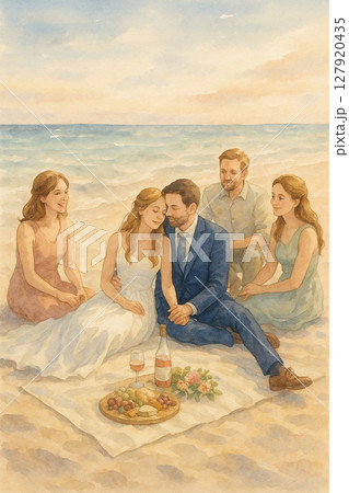 海灘婚禮後的浪漫晚餐 | 水彩風格的新婚夫婦和他們最好的朋友共度時光