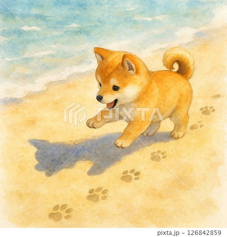 元気に海辺を走る柴犬の水彩イラスト Energetic shiba inu running by t