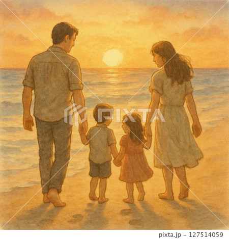 夕陽下的海灘漫步 | 家庭海灘日落插畫