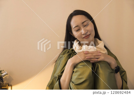 一位女士一邊享受艾草蒸氣浴一邊看書的圖片