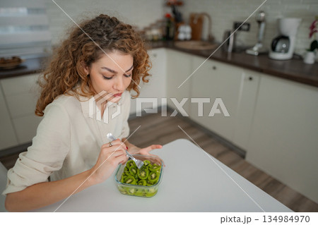 Woman eating fresh kiwi fruit for healthy diet breakfast