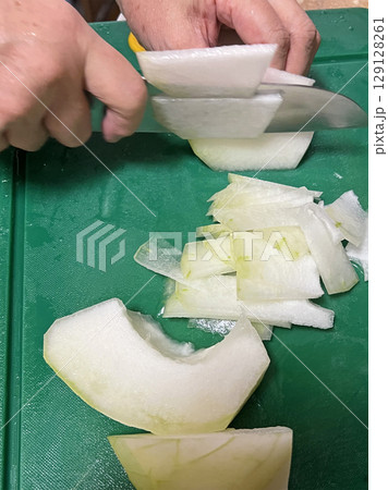 拍攝媽媽用菜刀將冬瓜切片準備煮湯的畫面