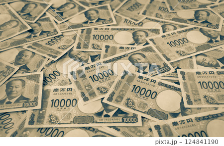 新的日本紙幣。正面全是大量一萬日元紙幣的負像。