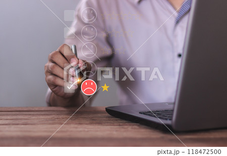 Consumer Satisfaction, Young man hand holding emoji to review and gives 1 star