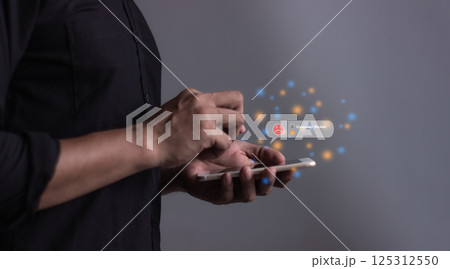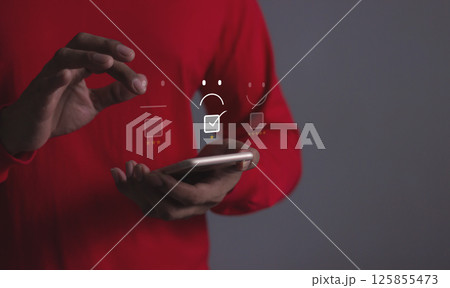 Young man uses smartphone mobile hand touching emoji to review and gives 1 star